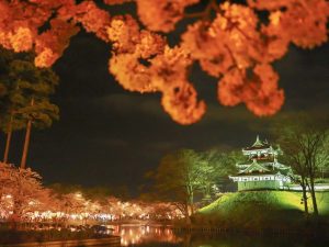 高田公園は、「日本三大夜桜」のひとつです。 高田城百万人観桜会」では、約3,000基のイルミネーションポイントが設置され、高田城とその周辺の約4,000本の桜を照らし出し、幻想的な光景を演出します。