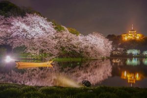横浜の中心部にある三渓園は、京都や鎌倉の古い建物が多く残る日本庭園です。 春には様々な桜が雲のように開き、夜にはライトアップされた桜がより一層魅力的です。