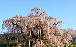 日本三大桜のひとつ、福島の三春滝桜は樹齢千年を超え、国の天然記念物に指定されています。 垂れ下がる枝にピンク色の小さな花が無数に点在し、まるで空に散った星のようでもあり、滝が流れ落ちるようでもある。