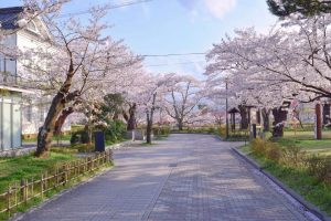 角館檜枝岐内川堤防は、2kmにわたって桜並木が続きます。 春には堤防沿いの桜が花のトンネルを形成します。 遠くに見える山や川、草原などの自然を背景に、桜の海をより一層美しく演出します。