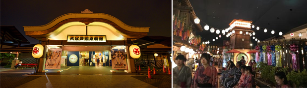 这里是一个再现“江户街道”的温泉主题乐园。穿着馆内准备的多彩浴衣,感觉有如江户时代的温泉疗养客一般。除了有利用地下1400米涌出的天然温泉外,还有不分男女可以一起使用的足浴和砂石浴、饮食区等,并有再现庙会日的游戏区域。
