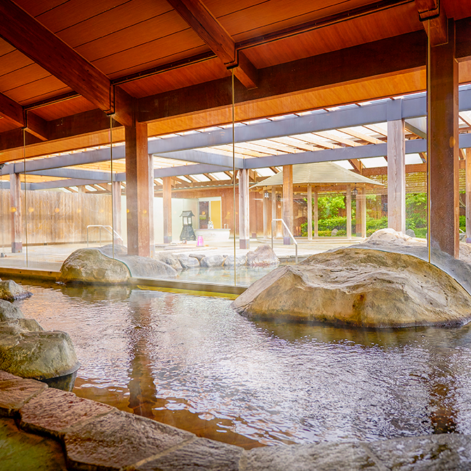 这里是一个再现“江户街道”的温泉主题乐园。穿着馆内准备的多彩浴衣,感觉有如江户时代的温泉疗养客一般。除了有利用地下1400米涌出的天然温泉外,还有不分男女可以一起使用的足浴和砂石浴、饮食区等,并有再现庙会日的游戏区域。